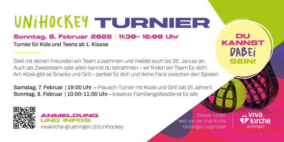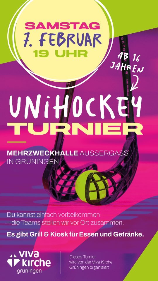 « Alle VeranstaltungenUnihockey TurnierFebruar 7 @ 19:00 - Februar 8 @ 17:00« Frauen KinoViva-Week 2026 » Über diesen Link kannst du dich anmeldenUnihockey Tunier 2026 Zum Kalender hinzufügen Google Kalender iCalendar Outlook 365 Outlook Live Details Beginn: Februar 7 @ 19:00 Ende: Februar 8 @ 17:00 Veranstalter Viva Kirche Grüningen Telefon 0782023136 E-Mail jochen.volker@vivakirche.ch Veranstaltungsort Mehrzweckhall Aussergass Grüningen,Zurich8627SwitzerlandGoogle Karte anzeigen Telefon 07822023136